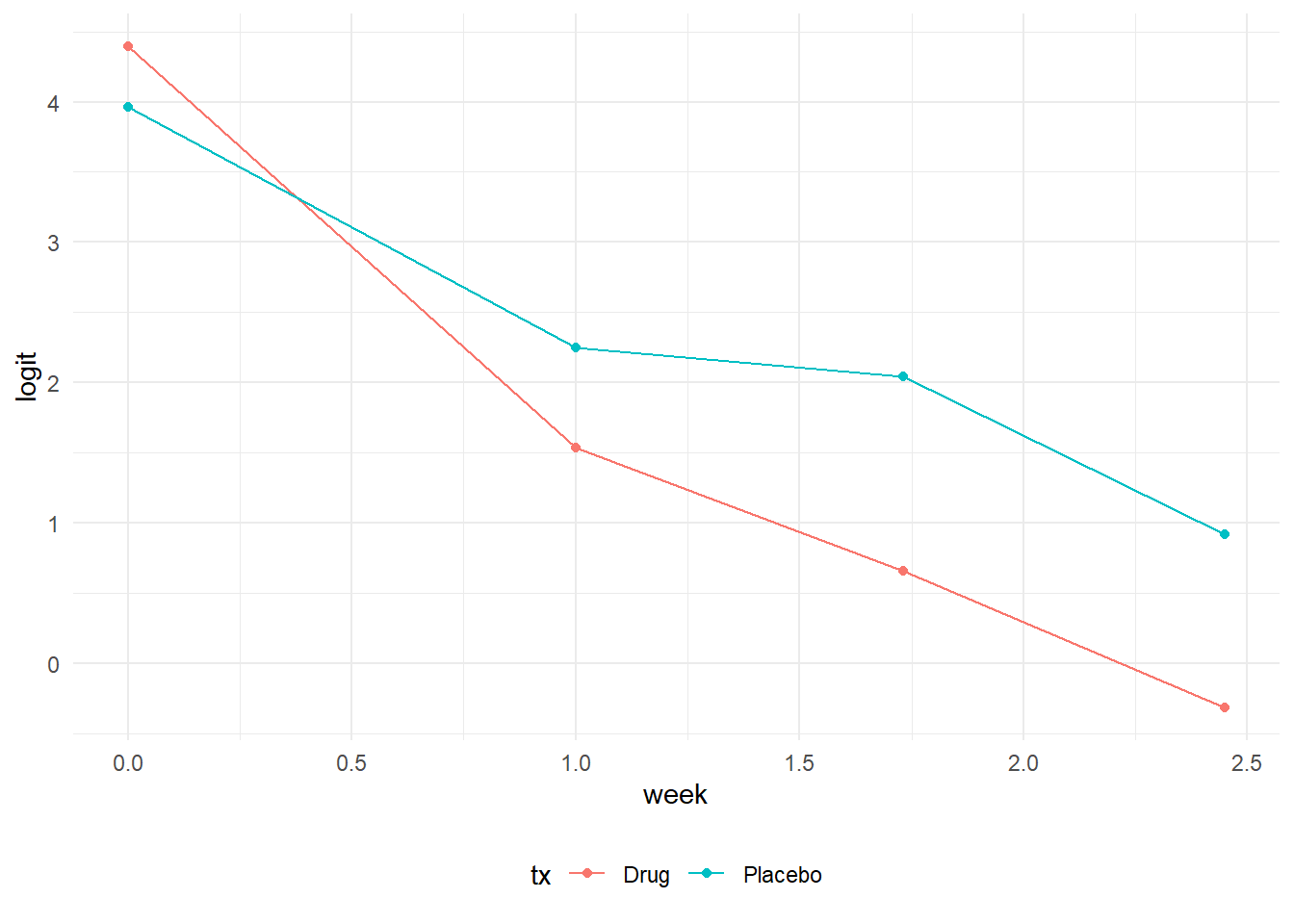 ggplot(aes(x = week, y = logit, color = tx, group = tx)) +
