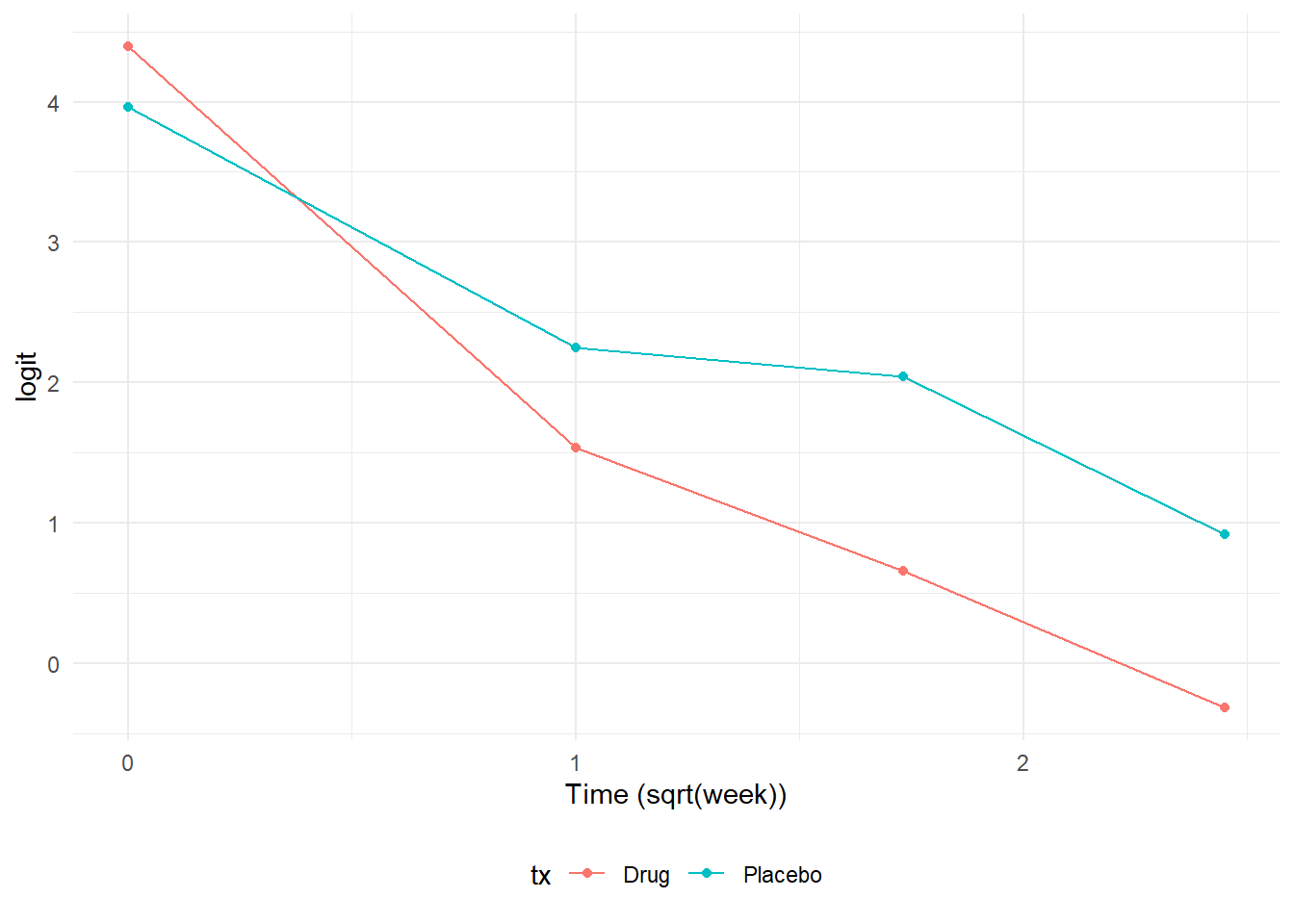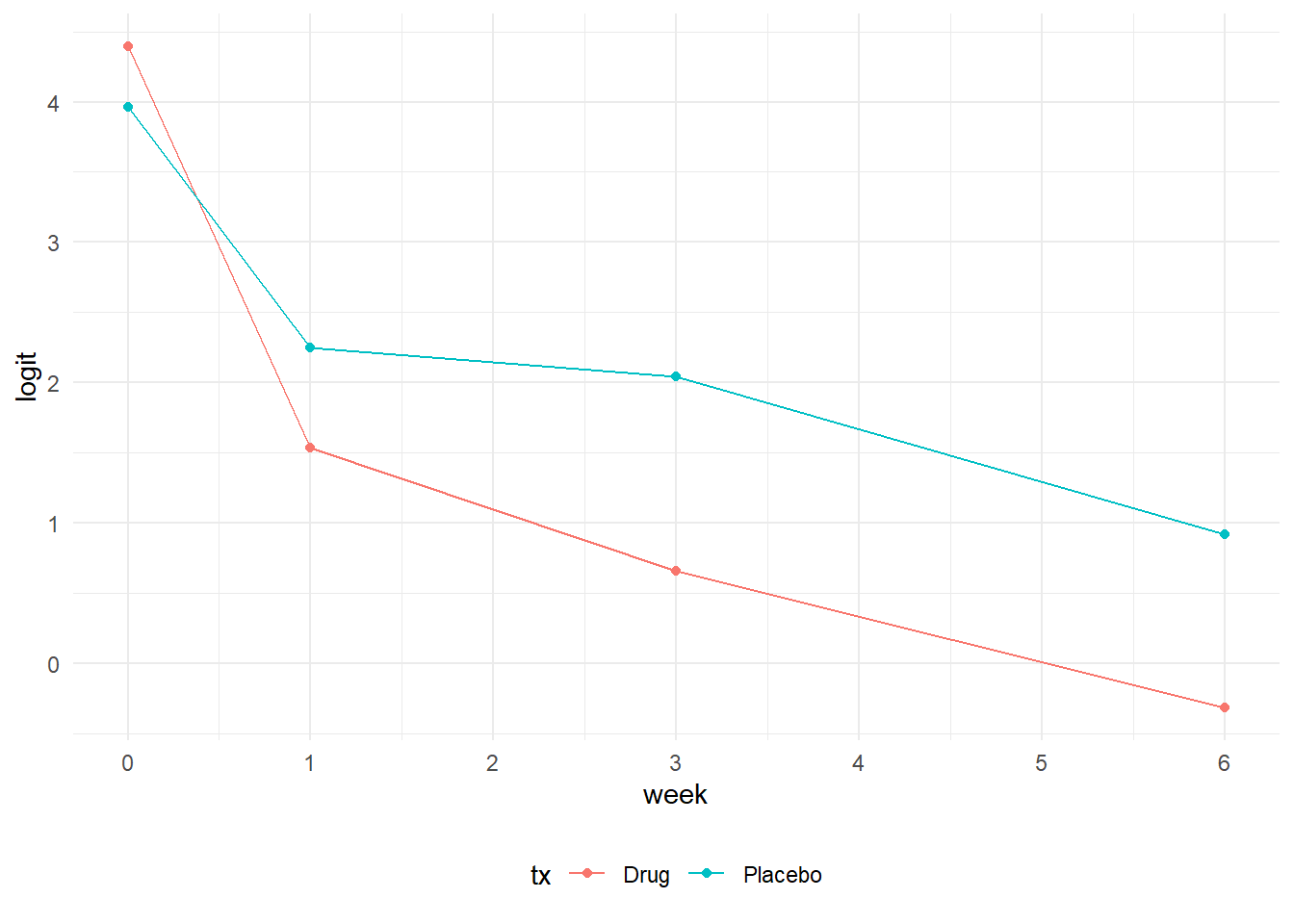 # The model uses tx = 0 or 1, but Placebo or Drug are going to be used in