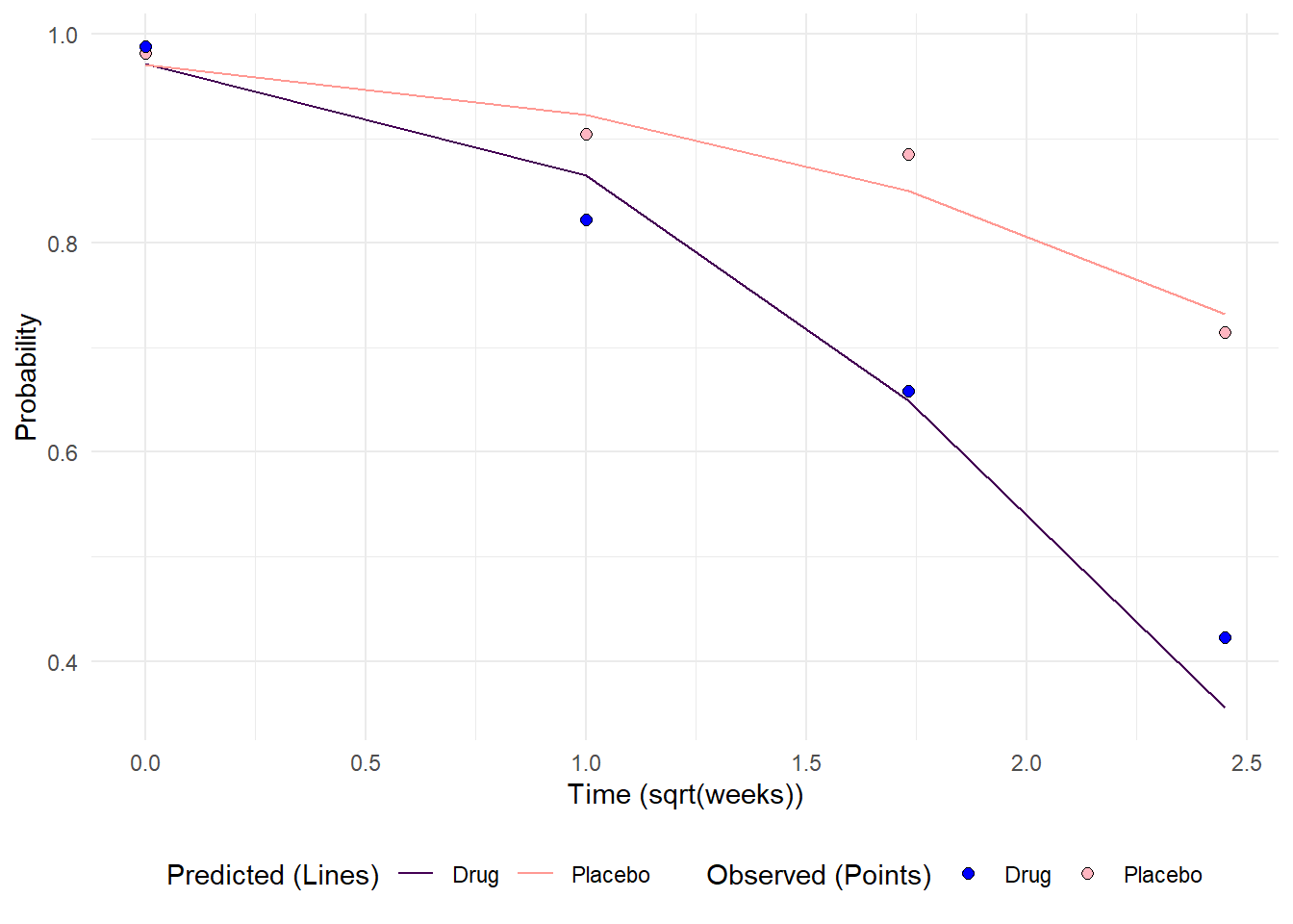 mutate(tx = ifelse(tx == 0, "Placebo", "Drug"))In the second step, we turn to preparing the observed probabilities. These were previously calculated in table 9.2.1. However these need to be converted into long format and contain the same y-axis variable as the predicted probabilities data frame. One key difference here is that tx will be renamed to tx_pts to enable setting different legends to the predicted and observed values.
